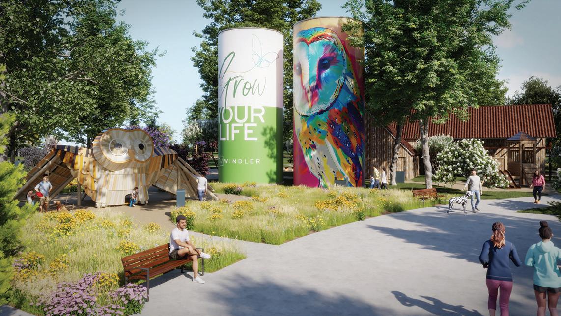 • Beginning with Eastside and The Homestead, the Windler community will feature several distinct neighborhoods, each with its own character and style. Eastside is home to DRB Homes, KB Home, Risewell Homes, and Tri Pointe Homes, which feature charming pocket parks and easy access to Discovery Park, the resort-style pool, and the Thrive Community Center. The Homestead neighborhood, featuring Century Communities, dives deep into the history of Windler with 1881 Park—where you’ll nd Anna’s Place and The Coop serving up local cra brews and bites, a pump track for di erent skill levels, in-the-neighborhood camping, a hammock grove, a massive owl play structure, and so much more.