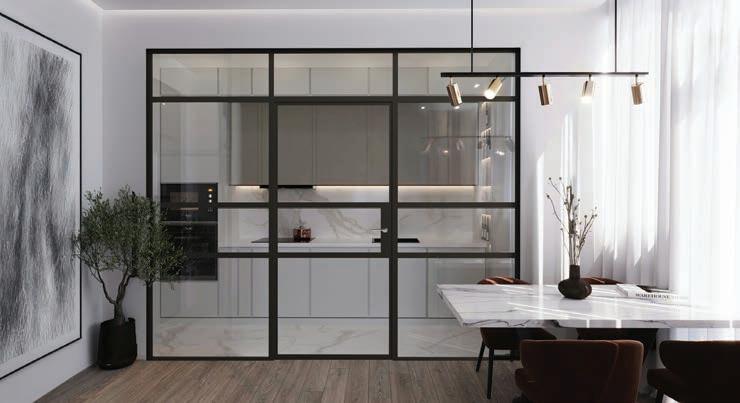 Regarding opening and closing, Design 35 o ers mechanical or magnetic locking mechanisms. A magnetic door catch, compatible with the Art In nity handle, has also been developed for the system. Additionally, this new interior division from Cortizo, whose glazing capacity reaches 12 mm, allows for faster production times through the incorporation of pre-assembled gaskets in the pro les.