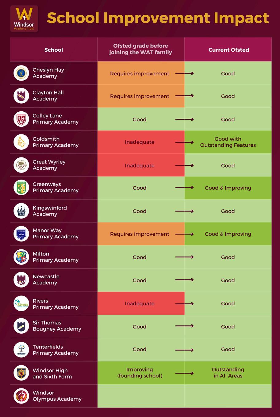This graphic opposite shows how schools across the Windsor Academy Trust family have improved since joining the Trust.