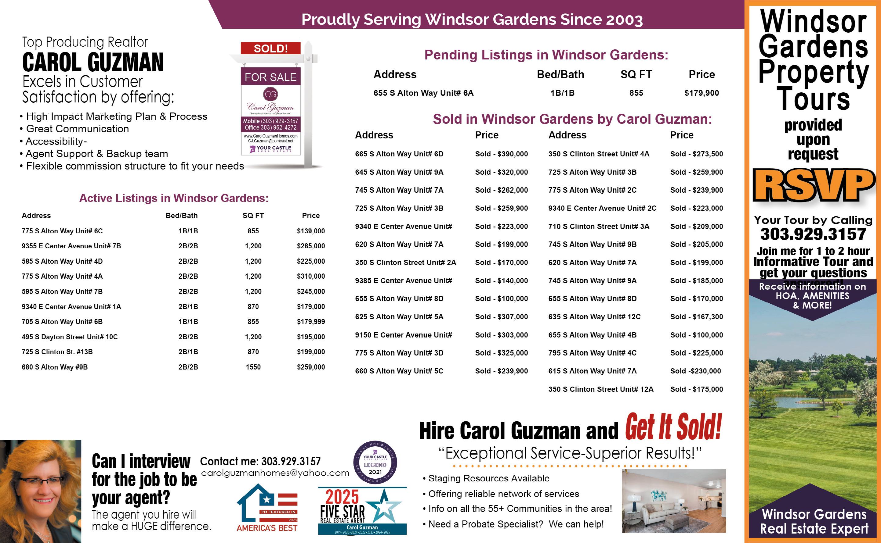 WE BUY WINDSOR GARDENS units or show you how to get $15 - $20,000 more than a Buy-Out. Mike Schoenecker & Co. 303-898-3963.