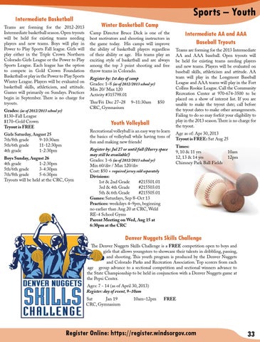 Sports – Youth Winter Basketball Camp Camp Director Bruce Dick is one of the best motivators and shooting instructors in the game today. His camps will improve the ability of basketball players regardless of their ability or age. His teams play an exciting style of basketball and are always among the top 3 point shooting and free throw teams in Colorado. Register by: 1st day of camp Grades: 1–8 (as of 2012/2013 school yr) Min 20/ Max 120 Activity #315798.01 Thu/Fri Dec 27–28 9–11:30am CRC, Gymnasium
