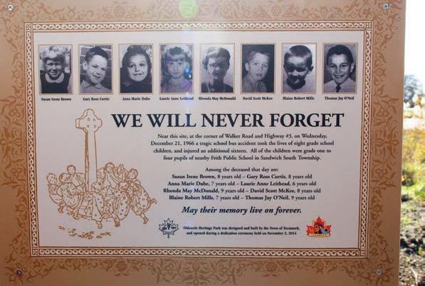 8newtreeshavebeenplantedatthe park...eachonerepresentingandidentifying oneoftheyoungvictims....ThomasO’Neil, 9,BlainMills,7,DavidMcKee,8,Rhonda MayMcDonald,9,LaurieAnnLeithead,6, AnnaMarieDube,7,GaryCurtis,8and SusanIreneBrown,also8.