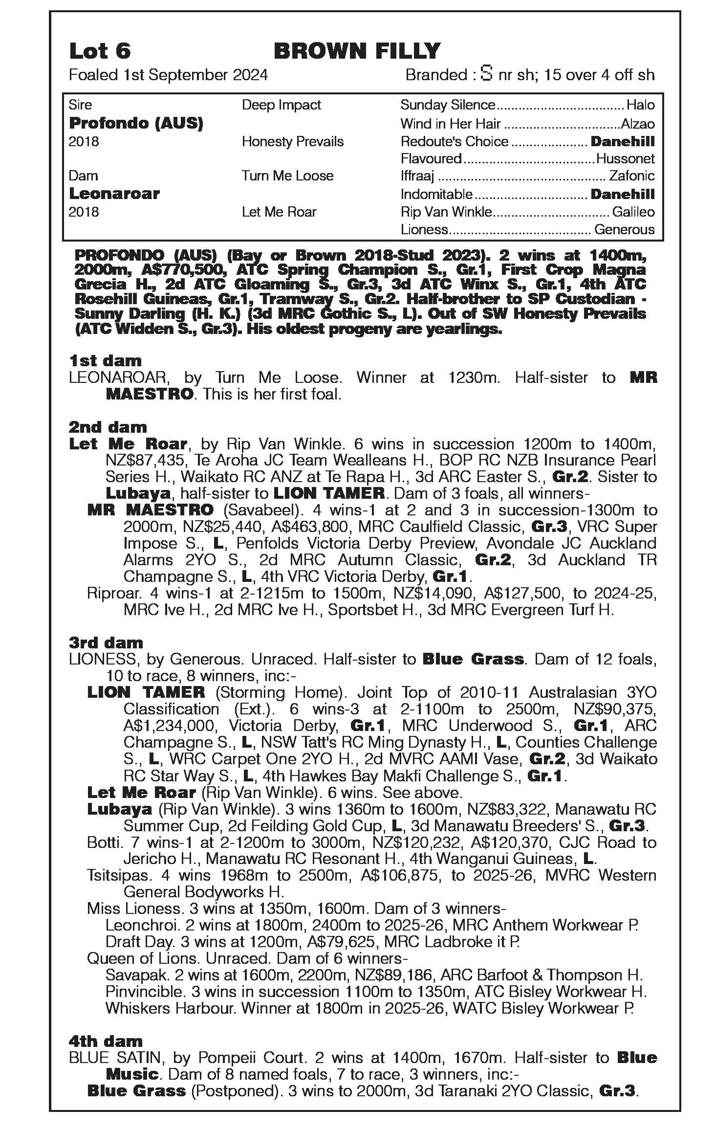 • Granddam LET ME ROAR, a high-class stakes mare, winning 6 times in succession and herself a half-sister to VRC Derby winner LION TAMER