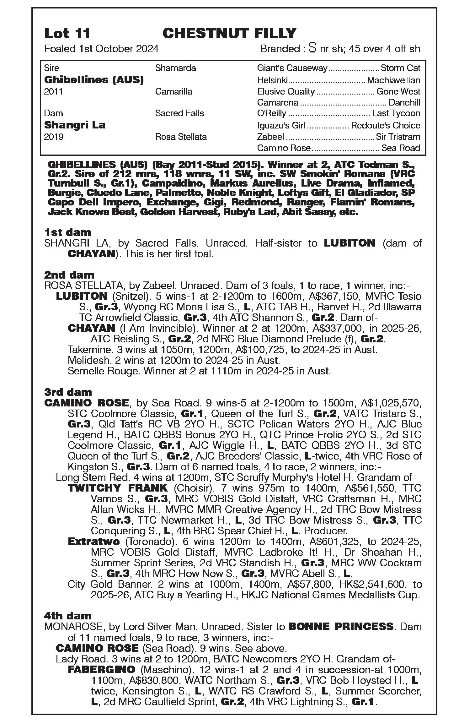 SHANGRI LA is a half-sister to Melbourne Group winner LUBITON, dam of impressive 2026 Gr.2 Reisling Stakes winner CHAYAN