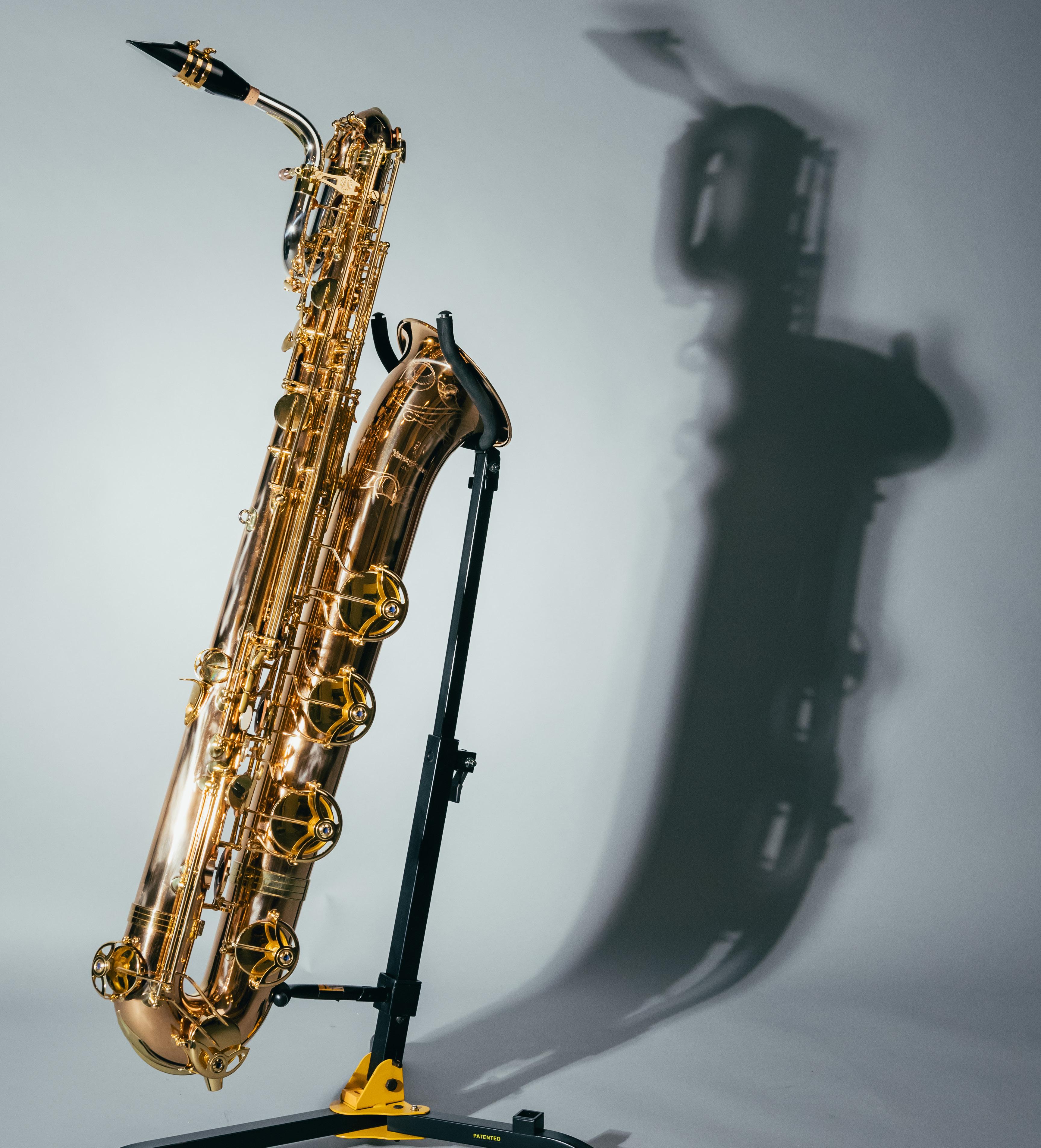 上低音薩克斯風(Baritone Saxophone)為降E調,實際音高比記譜低大13 度。體積重量將近中音薩克斯風兩倍,可用以作獨奏或者低音聲部,而在薩 克斯四重奏中,上低音薩克斯風以它低沉渾厚的音色把其他聲音承托起來。