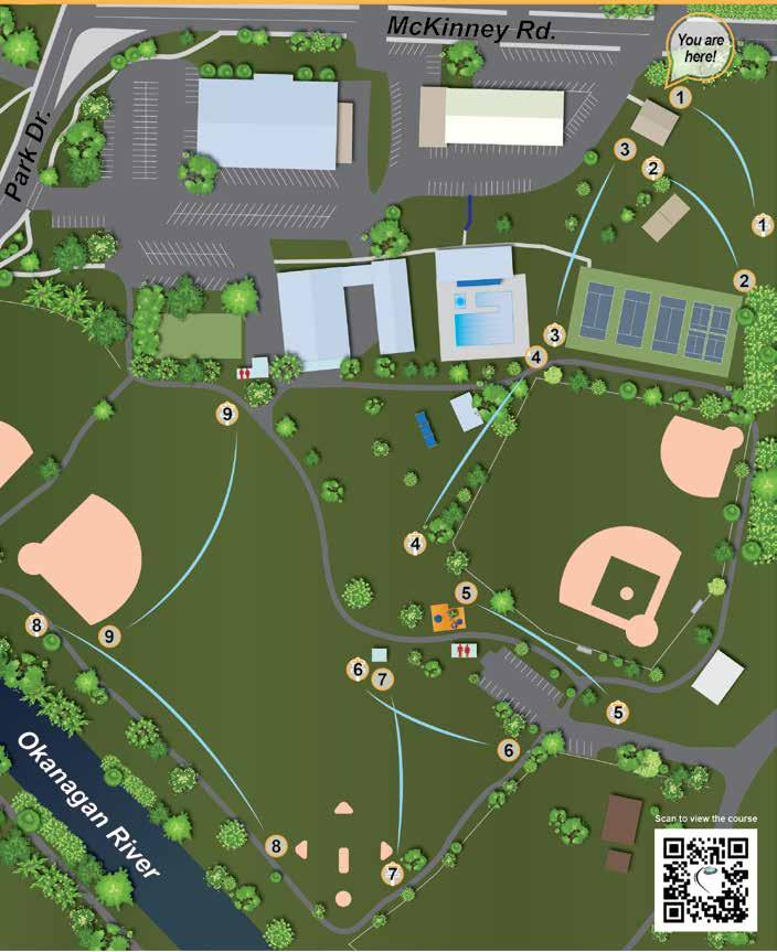 The kiosk at the start of the course has now been installed as well as tee signs for each hole, including QR codes that can be scanned to view the course map wherever you are. Want to give the course a try but don’t have discs?
