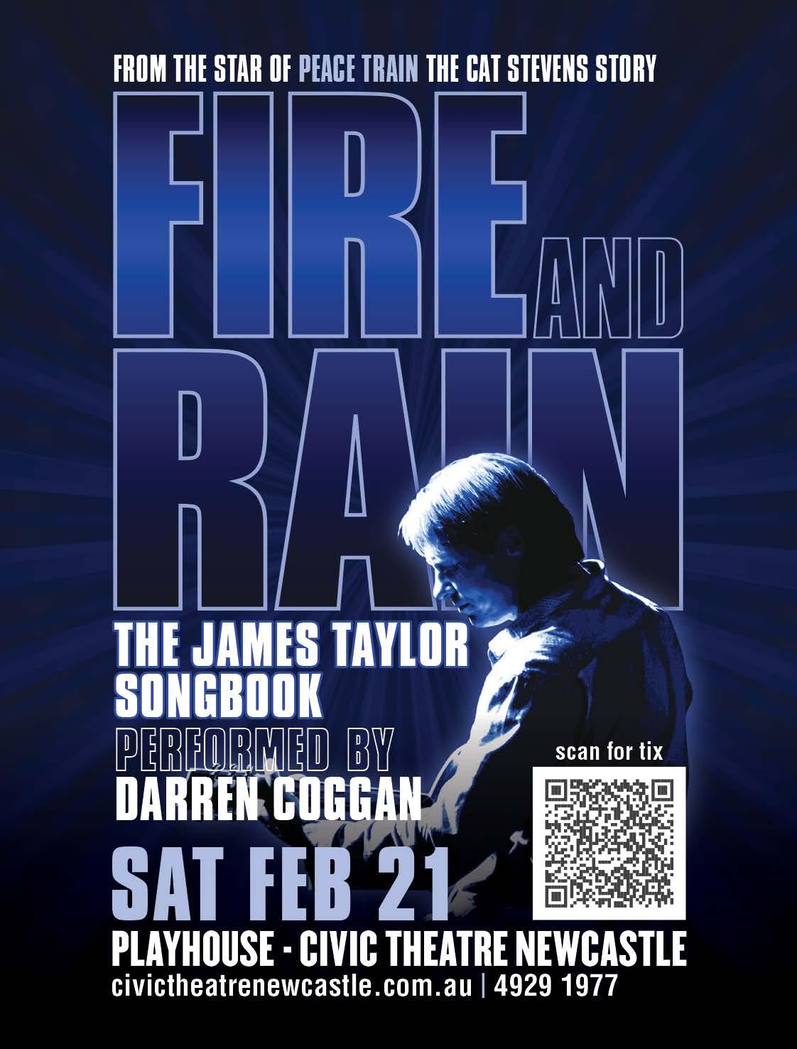 ▲ Acclaimed Australian performer Darren Coggan brings his celebrated show 'Fire & Rain' to Newcastle's Civic Theatre Playhouse, honouring James Taylor's timeless songbook. Following sold-out seasons at Sydney Opera House and venues worldwide, Coggan delivers masterful storytelling through beloved classics, including "You've Got a Friend" and "Carolina in My Mind." For more information, visit www.civictheatrenewcastle.com.au.