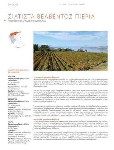 ΟΙ ΑΜΠΕΛΟΥΡΓΙΚΕΣ ΖΏΝΕΣ ΜΕ ΜΙΑ ΜΑΤΙΆ: ΣΙΑΤΙΣΤΑ Έκταση αμπελώνων: 250 ha Οινοποιεία: 2 Π.Γ.Ε.: Σιάτιστα Ποικιλίες: Λευκές: Μπατίκι, Πρικνάδι, Gewürztraminer Ερυθρές: Ξινόμαυρο, Μοσχόμαυρο, Χονδρόμαυρο, CS, CF, Merlot, Cinsault ΒΕΛΒΕΝΤΟΣ Έκταση αμπελώνων: 100 ha Οινοποιεία: 3 Π.Γ.Ε.: Βελβεντός Ποικιλίες: Λευκές: Ασύρτικο, Μαλαγουζιά, Ροδίτης, Chardonnay Ερυθρές: Ξινόμαυρο, Μοσχόμαυρο, Λημνιώνα, CS, CF, Merlot, Syrah ΠΙΕΡΙΑ Έκταση αμπελώνων: 224 ha Οινοποιεία: 10 Π.Γ.Ε.: Πιερία Ποικιλίες: Λευκές: Ασύρτικο, Μαλαγουζιά, Ροδίτης, Σαββατιανό, SB, Chardonnay, Trebbiano Ερυθρές: Ξινόμαυρο, Λημνιώνα, Αγιωργίτικο, CS, Merlot, Syrah, Cinsault, Grenache Rouge