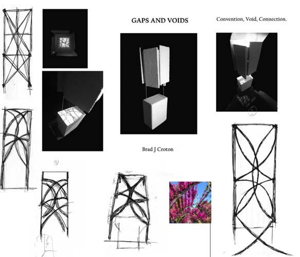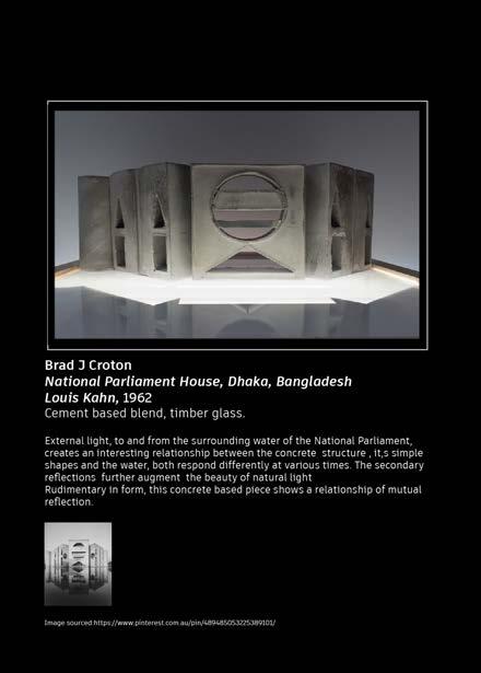 Operational Architectural History, Is included within the new line of curriculum at Gri th University. A new Interpretation of history curriculum, meant an opportunity to interpret, curate and produce an exhibition, centering around a chosen architect. For me, this experience, and Louis Kahn’s body of work repre sented an opportunity to apply writing skills in combination with hands on skills acquired over a working life. The choice, to interpret this task using physical models and light, yielded a responsive result from fellow students and teaches a like; resulting In six pieces being displayed within the entrance of the building. Although, the majority of responses from fellow students were within the digital domain, most were equally inspiring to me. On re ection, although people, younger or older have di erent approaches, both can teach and inspire the other, have value and manifest equality within a work place.