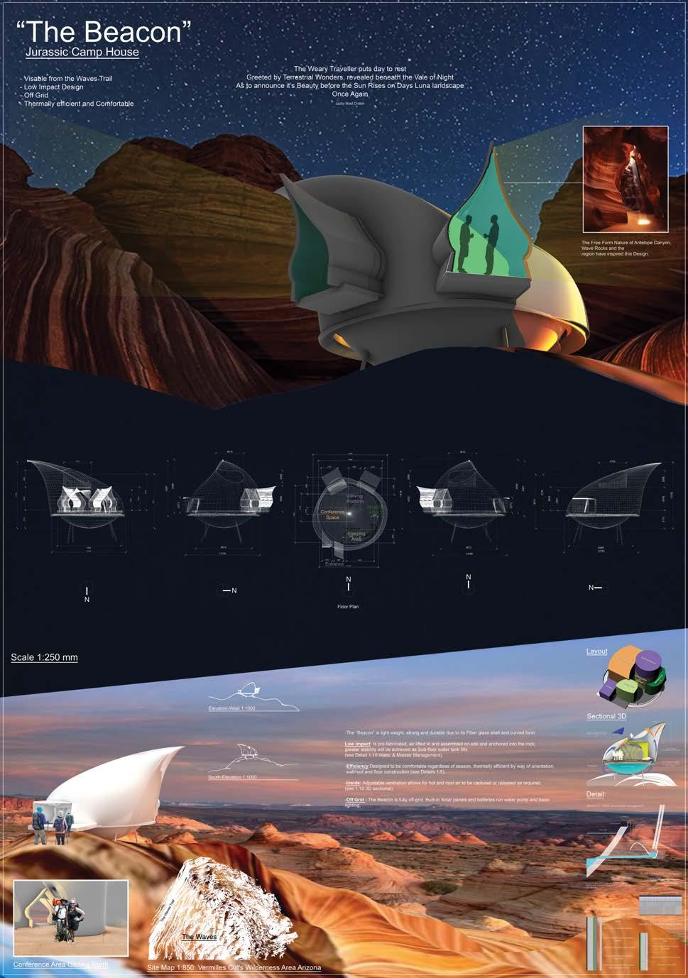 Theres, a broad spectrum of design competitions out there to choose from on an annual basis. The Special Media Topic coarse o ered In the third trimester 2020 required the participant to choose one. The trimester allowed, for choices outside of convention. Wanting to challenge myself to something ‘out side the box’, drew me to the ‘The Jurassic Space Camp, with a Poetic response’. Inspired by a stunning, Praia Canyon, Vermilion Cli s Wilderness Area setting in Arizona, USA, resulted In the free-form alien like interpretation to the left. This was a fun and interesting project, that re-iterates that we should always nd the joy in what we do and to take a break away from the serious from time to time, as enjoyment and creativity are important, and can bene t many aspects of your life.