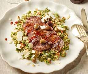 Verdeel de stamppot over de borden en garneer met geroosterde pijnboompitten, de rumpsteak, parmezaan, warme olijven en balsamico-jus.