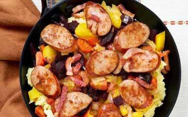 Doe de aardappelpuree in een brede schaal en verdeel hierover het wortelmengsel. Leg er tot slot de plakjes gegrilde rookworst op en besprenkel ze met de uitgebakken spekreepjes.