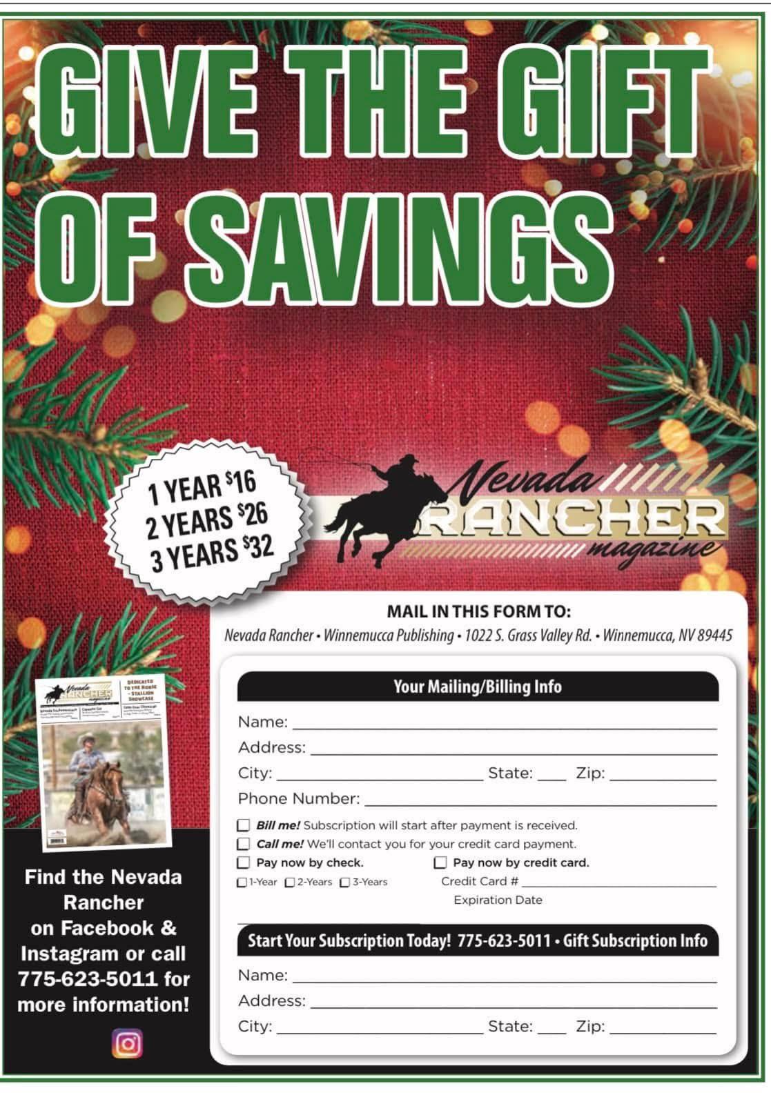 The Nevada Rancher does not assume responsibility for statements by advertisers nor products advertised within, and The Nevada Rancher does not assume responsibility for opinions expressed in articles submitted for publication. The publisher reserves the right to accept or reject advertising or editorial material submitted for publication. Contents in The Nevada Rancher may not be reproduced, in whole or in part, including, but not limited to original contents and original composition of all ads (layout and artwork) without prior written permission. Subscription rate: $16.00 per year. All content copyrighted, December 2025.