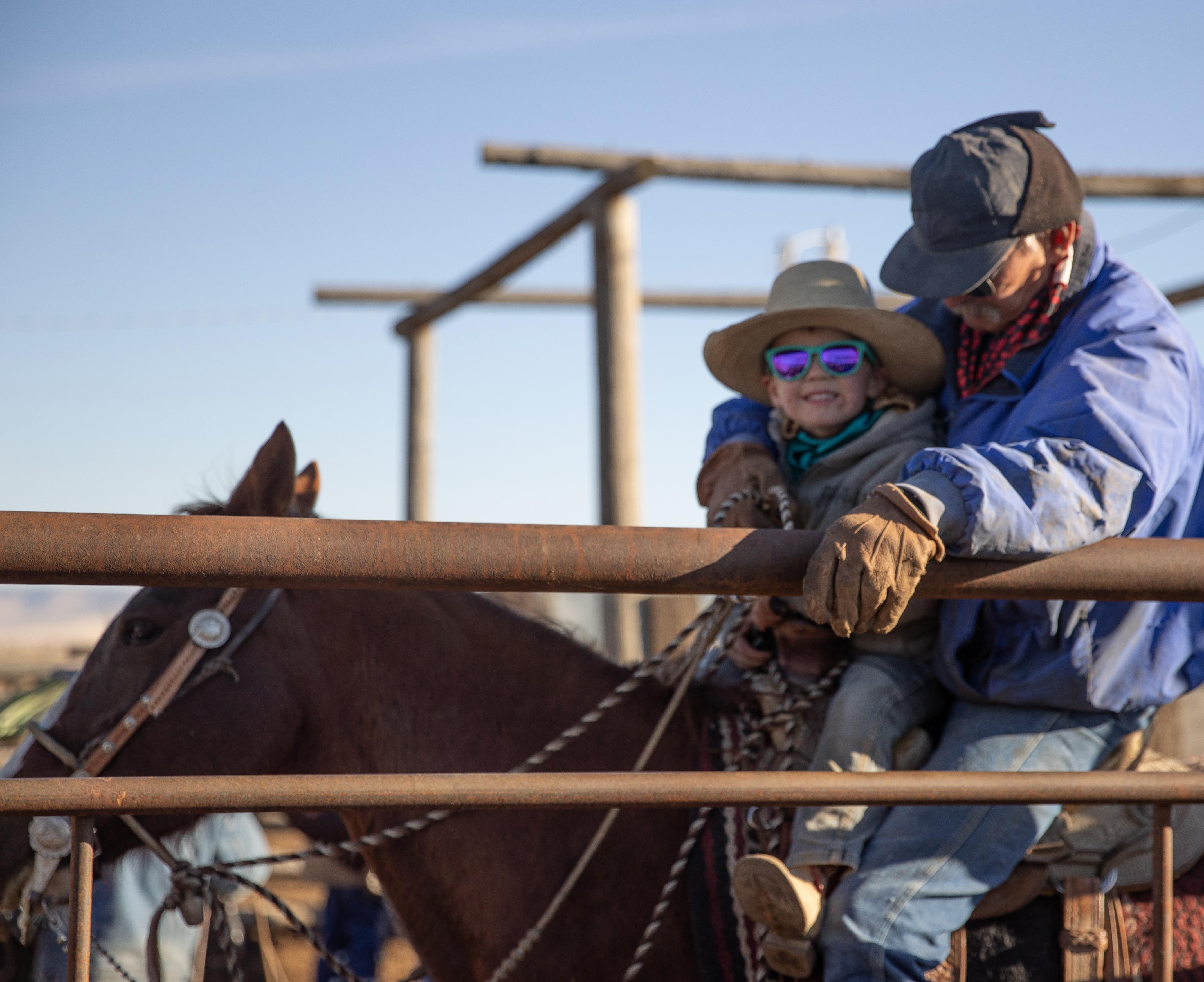 Casey Gallagher (Son of Becky (Kershner) & Jack Gallagher, horseback with Lloyd Sherburn while shipping at the UC Ranch outside of McDermitt, NV. Grateful for the future generations, a good horse and fat cattle.
