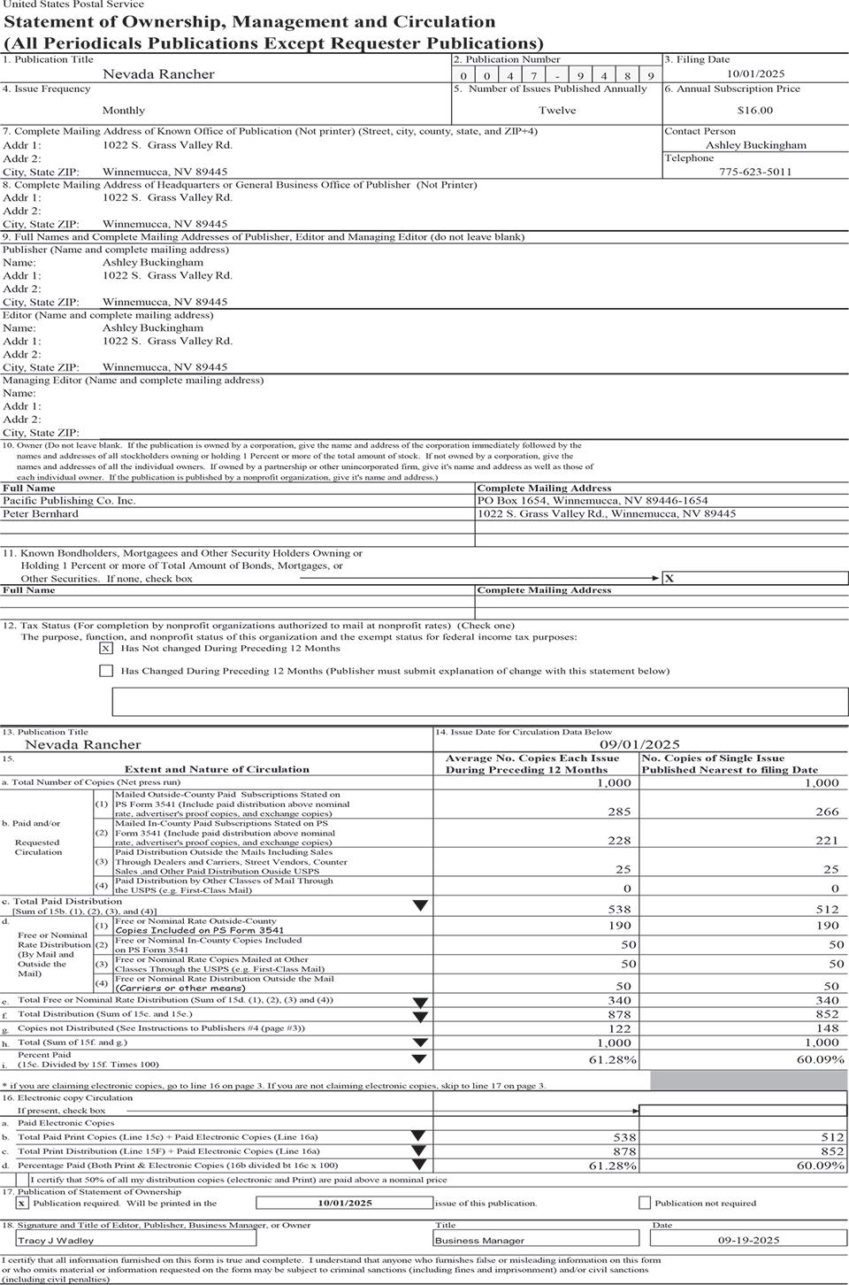 The Nevada Rancher does not assume responsibility for statements by advertisers nor products advertised within, and The Nevada Rancher does not assume responsibility for opinions expressed in articles submitted for publication. The publisher reserves the right to accept or reject advertising or editorial material submitted for publication. Contents in The Nevada Rancher may not be reproduced, in whole or in part, including, but not limited to original contents and original composition of all ads (layout and artwork) without prior written permission. Subscription rate: $16.00 per year. All content copyrighted, September 2025.