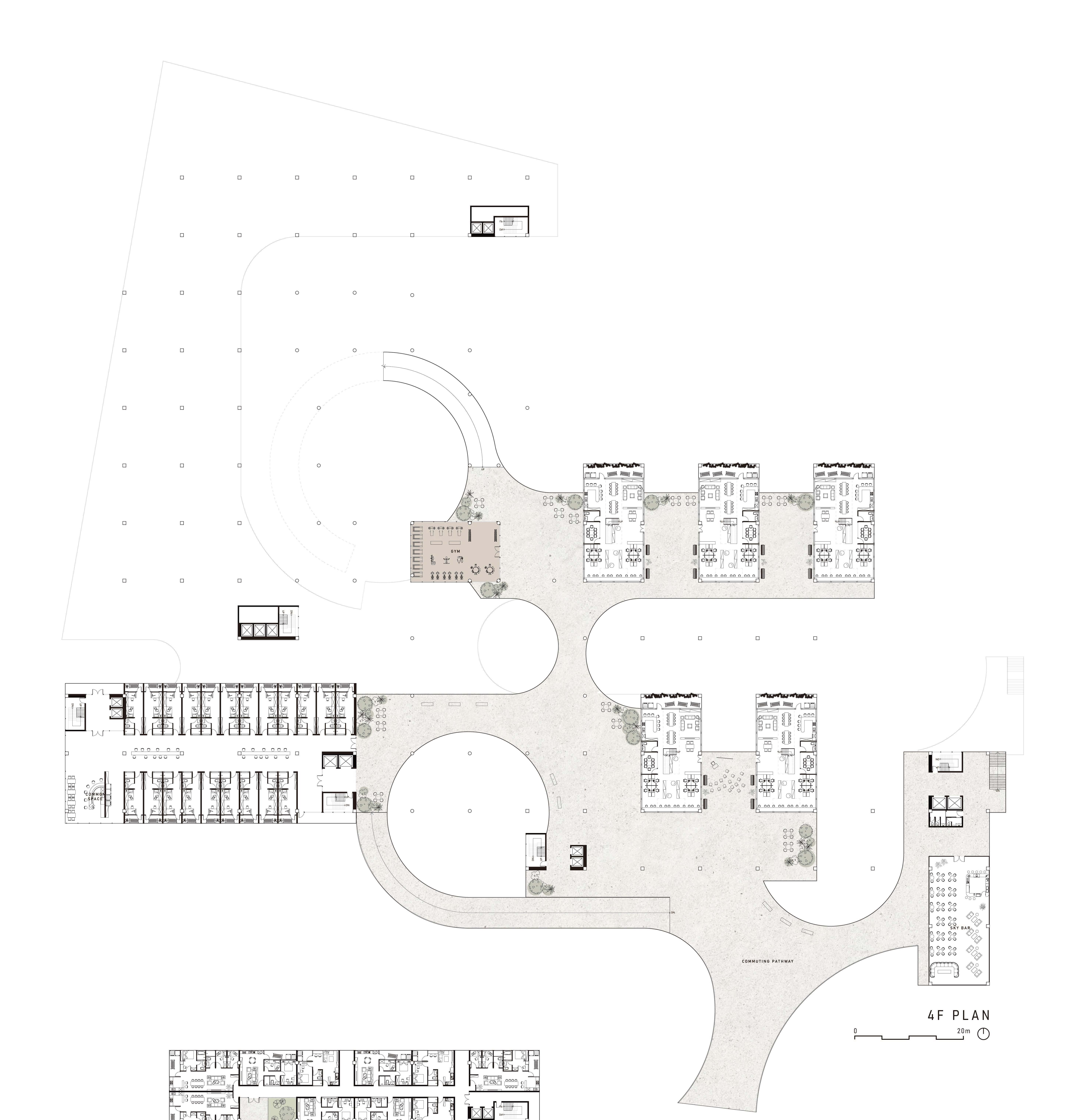 Talking about the façade and interior partitions, the spaces are separated by non-obstructive, transparent, or semi-transparent means, allowing people to easily observe the behavior of those around them as they move inside or outside the building. By witnessing the daily lives of others, this project aims to inspire people to expand their imaginations and create a richer life for themselves.