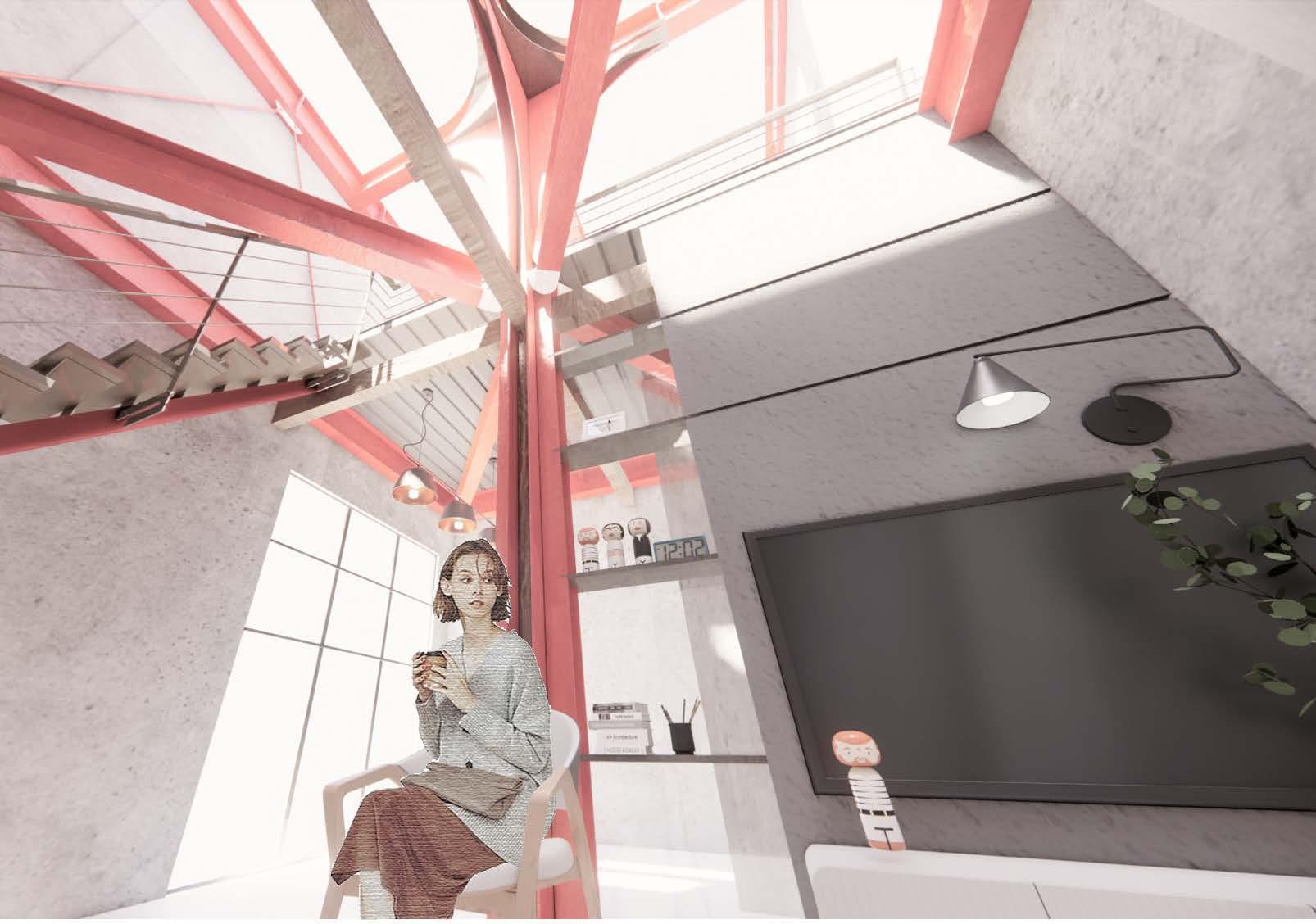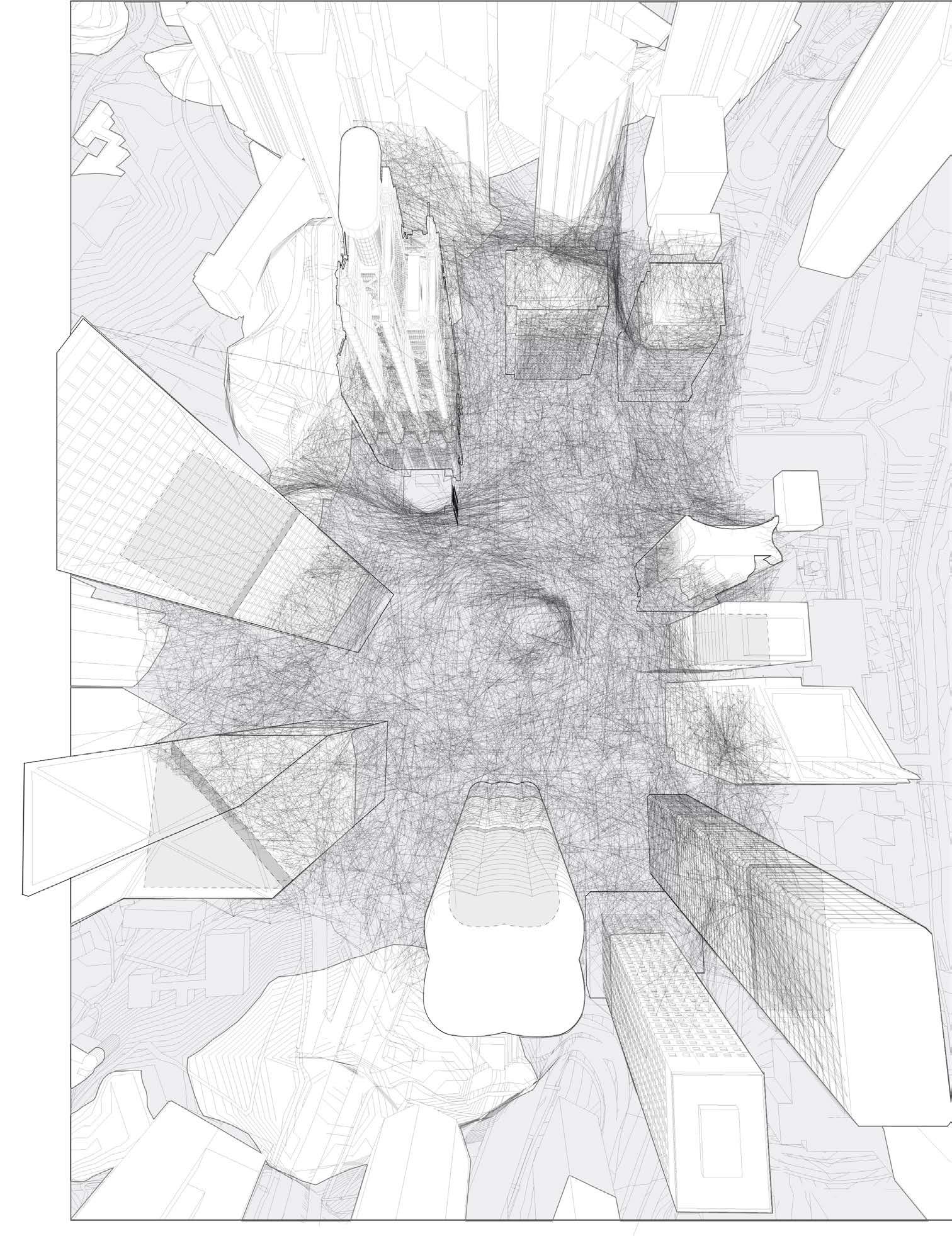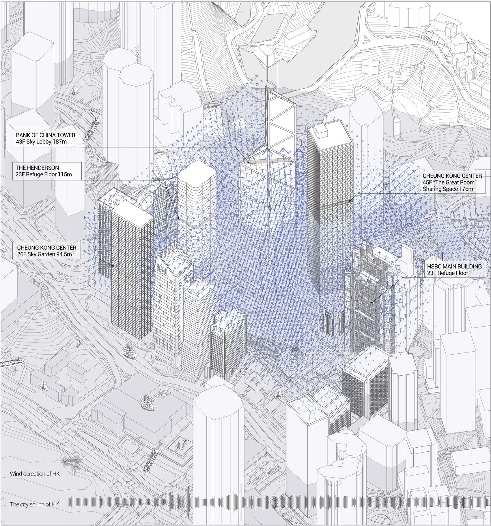 Starting from this phenomenon, I envisioned that in a future of rising sea levels, choosing Hong Kong, a city dotted with Linyphiidae, when the ground is inundated by floodwaters and the city's necessary public spaces turn to the air, how will the new sheltered buildings at this time interact with the environment or interact with people?