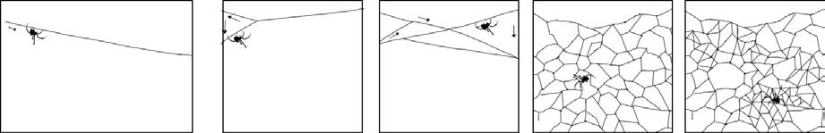 The spider's sheet web returns to the original silk at each point of weaving, and the original thread is pulled to become two segments, as in Stephen wolfram's mathematical mode {{1, 2}, {1, 3}}--{{1, 2}, {2, 3}, {3, 4}, {2, 4}}--{{1, 2}, {3, 4}, {2, 4}, {2, 5}, {3, 5}, {4, 5}}