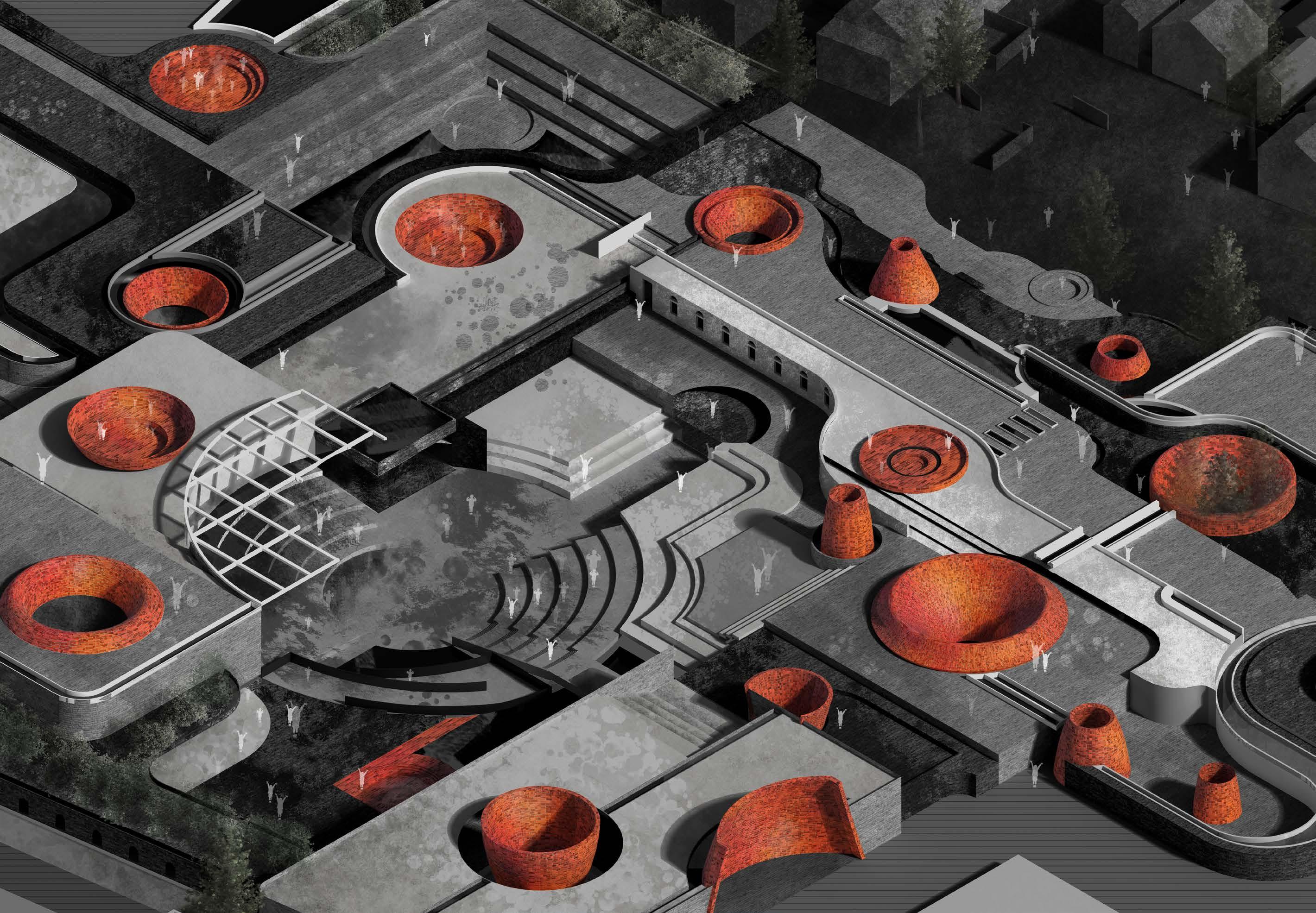 the core inspiration for the project, embodying the transformative power of fire as the origin of architecture.