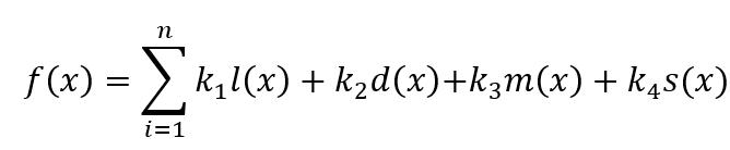l(x)=k*1/daylight hours, d(x)=k*demolished wall length, m(x)=k*1/area, s(x)=k*aspect ratio of all the formed space