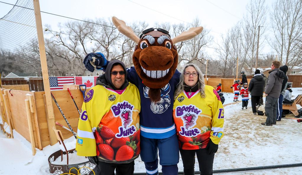spring warm spell didn’t dampen this neighbourhood skating party, presented by Booster Juice, with Mick E. Moose and members of the team hosted at the impressive Matychuk family rink in Starbuck, Man.