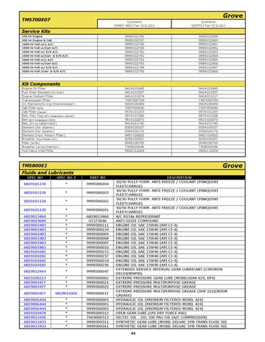 Service Kits 250 Hr Engine 500 Hr Engine & Cab 1000 Hr Full w/o A/C 1000 Hr Full w/Carr A/C 1000 Hr Full w/ S/S A/C 1000 Hr Full w/Carr & S/S A/C 2000 Hr Full w/o A/C 2000 Hr Full w/Carr A/C 2000 Hr Full w/ S/S A/C 2000 Hr Full /Carr & S/S A/C