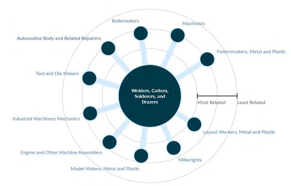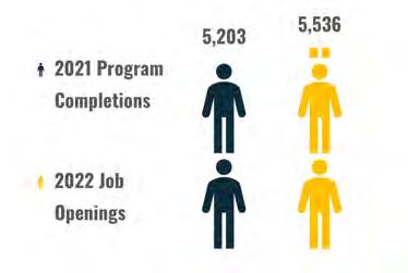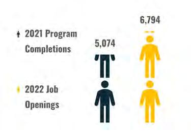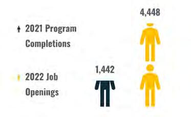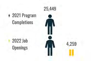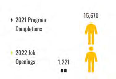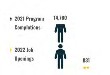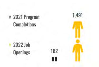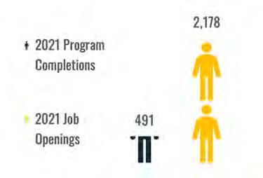 In 2021, there were 491 welder educational program completions, with the Welding Technology/ Welder educational program having the highest completion number. Another welding program that had a high completion number is the Welding Engineering Technology/Technician program. Completions in these and similar programs within the region are shown below compared to job openings.
