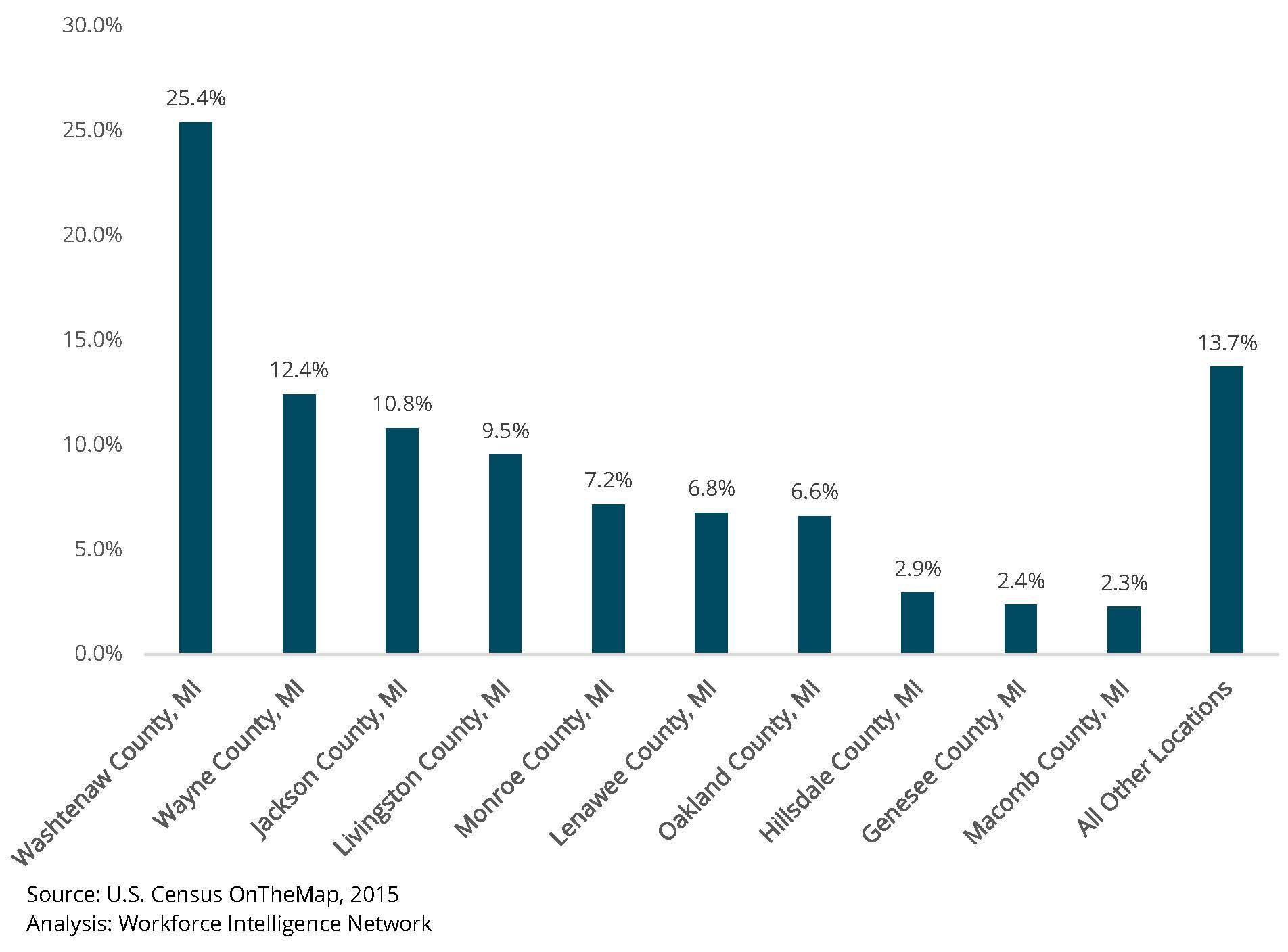 The WIN partnership region’s labor shed highlights why, when it comes to talent, we must think regionally: The workforce is mobile. Although 90.4% of the region’s workforce live and work1 in the 19-county area, not all residents work in their home county. It is not uncommon for workers to commute one or two counties over for work. This means that the residents in every county should be ready for the job demands of employers hiring throughout southeast Michigan.