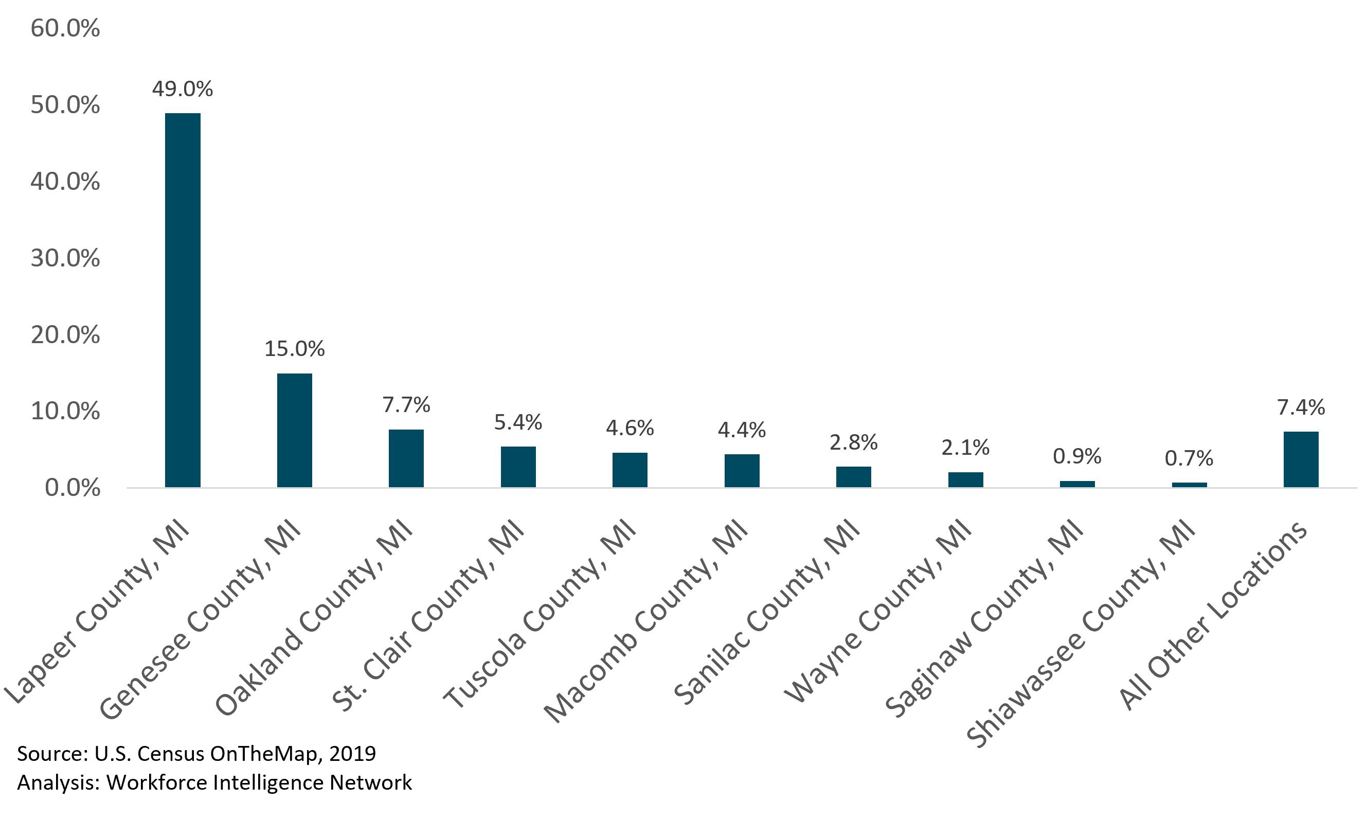 The great majority of workers that travel to Lapeer reside in either Genesee or Oakland counties. 2,988 (15.0%) of Lapeer County workers travel in from Genesee County followed by 1,529 (7.7%) that travel in from Oakland County. 5,187 (26.1%) of the 19,934 workers employed in Lapeer County traveled more than 25 miles to their place of employment in 2019.