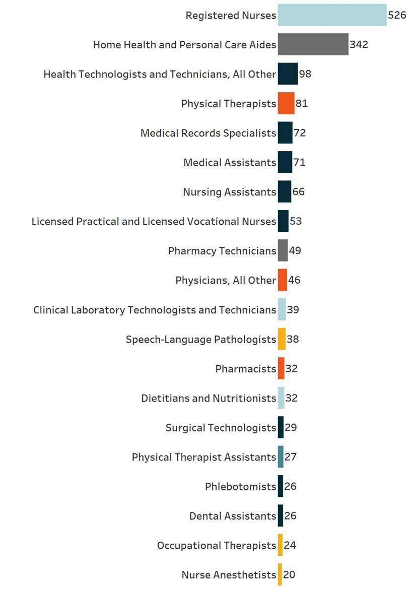 Registered Nurses was the highest in-demand Health Care occupation throughout 2023, with 526 postings. Other top posted jobs include Home Health and Personal Care Aides (342 postings), Health Technologists and Technicians, All Other (98 postings), Physical Therapists (81 postings), and Medical Records Specialists (72 postings). Top occupations in Health Care are available at many education levels, and employment for some roles, such as Home Health and Personal Care Aides and Pharmacy Technicians, only require a High School diploma or equivalent, coupled with short to moderate-term on-the-job training.