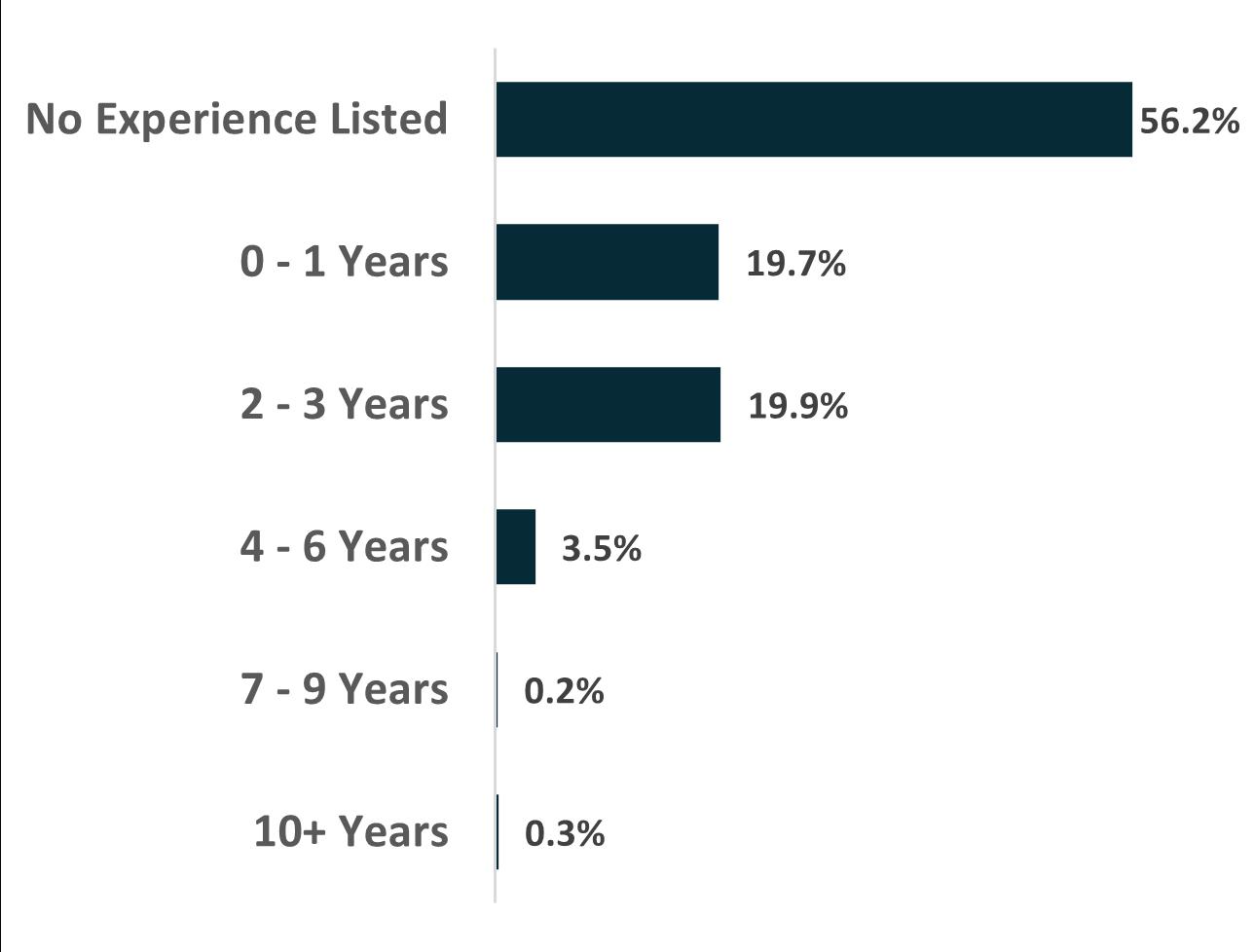 The Energy occupation group requires a specialized workforce with specific skills. A bachelor's degree is the most indemand education level in Q3 with 52 percent of 2,318 postings. A master’s degree is the third most in-demand education level with 16 percent, while 4 percent require a Ph.D. The amount of experience required varies widely from none to over ten years, although a majority require at least two years. Even many energy occupation postings do not request any specific experience.