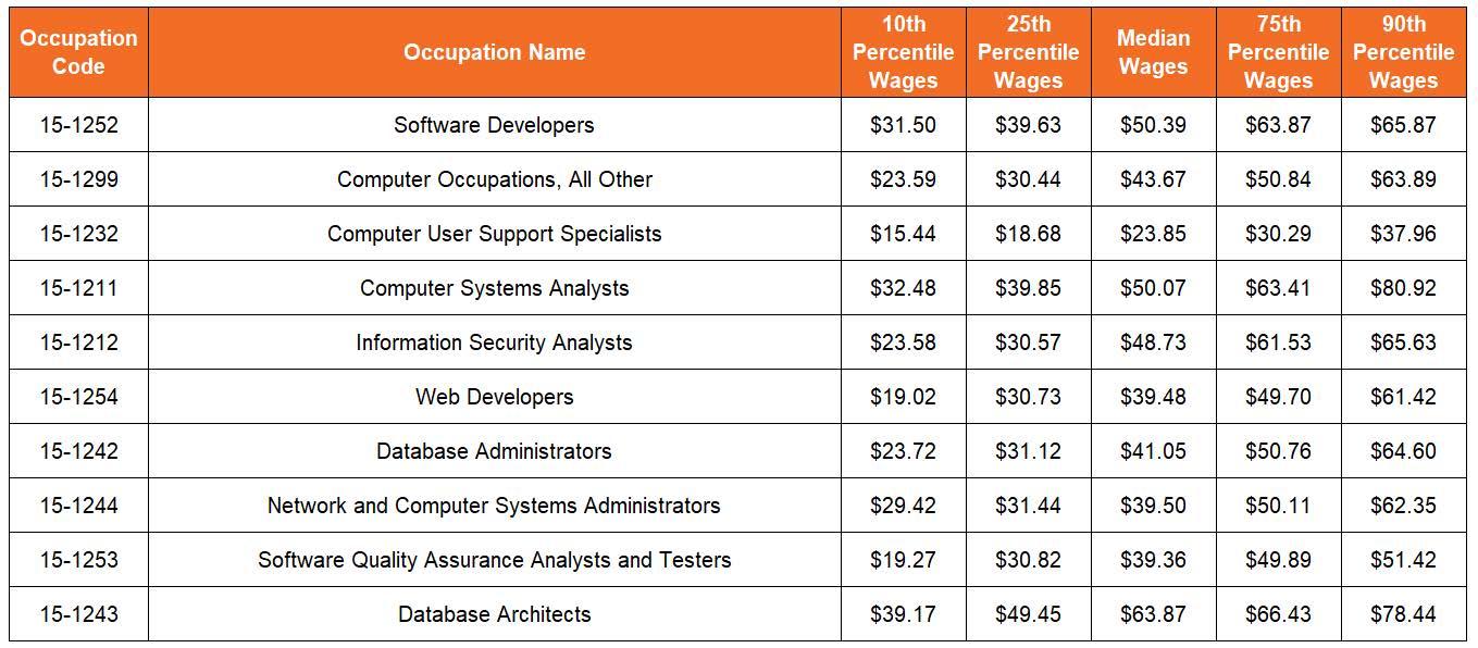 Most IT jobs offer high wages, making for a lucrative opportunity for job seekers able to obtain the additional education related to these jobs. Software Developers, the top posted IT job in Q3, offers a median hourly wage of $50.39 ($104,811 annually). Computer User Support Specialists, which requires some college, no degree, offers a median wage of $23.885 ($49,608 annually).