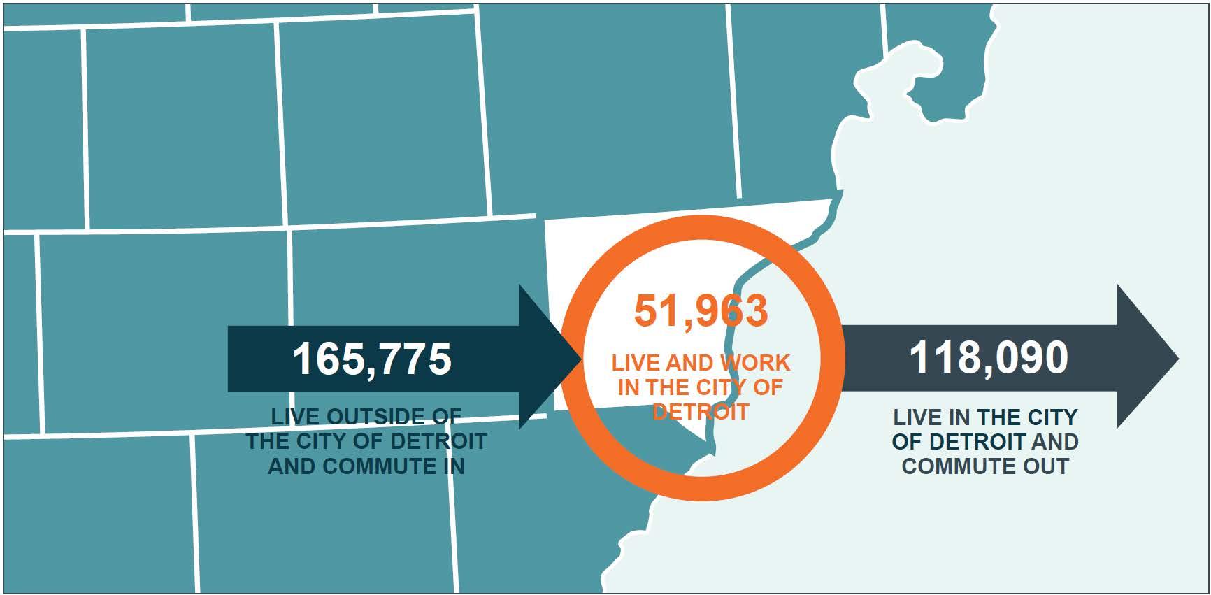 According to the most recent OnTheMap data set from the Census Bureau, Detroit's 2021 workforce consisted of 170,053 individuals. There were 51,963 (30.6 percent) residents also worked in the city, while the remaining 118,090 residents (69.4 percent) traveled outside for work. With 217,738 workers employed in the city during 2021, there were 165,775 (76.1 percent) workers living outside of the city and commuting in. While there is a higher percentage of both inbound and outbound commuters in Detroit than other areas of the WIN regions, Detroit is ultimately a net importer of jobs, with more workers commuting into the area for employment than leaving.