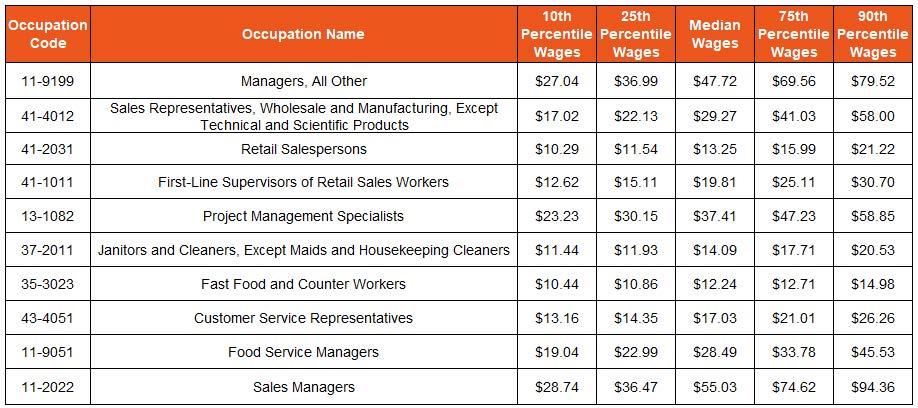Despite being in high demand, most Customer Service-related occupations offer relatively low wages. However, six of the top ten posted occupations report median wages over $18.00 per hour, many of which are management roles requiring both experience and training. The top posted occupation, Managers, All Other, earns a median hourly wage of $47.72 or $99,257 annually.