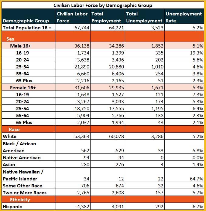 Following labor force fluctuations throughout 2023, labor force participation totaled 65,365 individuals, an increase of 860 individuals from 2022. Employment is up to 62,459 workers in 2023, an increase of 852 workers. Additionally, Unemployment increased to 2,905 workers, up by 8 workers from 2022. On the other hand, the unemployment rate declined by 0.05 percent for a 2023 unemployment rate of 4.4 percent.