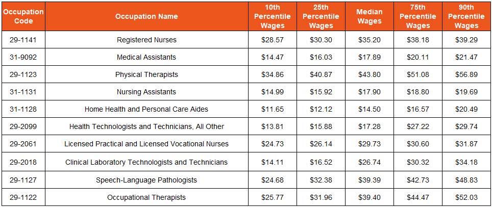 Wages in the Health Care field tend to scale with both education and experience. The Health Care occupation group offers a relatively broad array of entry requirements and a high volume of jobs are open to candidates with Doctoral or professional degree. At least half of the top jobs pay over $26.74 per hour. Registered Nurses, the top posted Health Care job, offers a median hourly wage of $35.20 per hour or an annual salary of about $73,220.