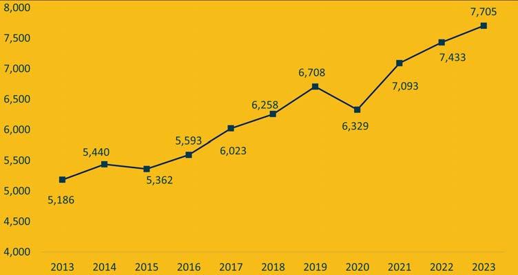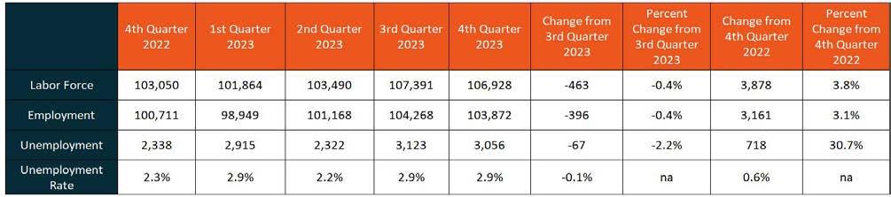 The quarterly labor market shifts observed during the height of the coronavirus pandemic have further stabilized in 2023. The second and third quarters of 2023 saw a slight increase in the labor force and employment, unemployment while the unemployment rate increased by 0.7 percent to 2.9 percent in Q3 2023. The labor force and employment numbers peaked in Q3 2023 with a high of 107,391 individuals and 104,268 workers respectively. Total unemployment fluctuated through each quarter of 2023 and the unemployment rate ended the year at 2.9 percent. For more information about this year’s unemployment rate and other labor market indicators are on page 4.