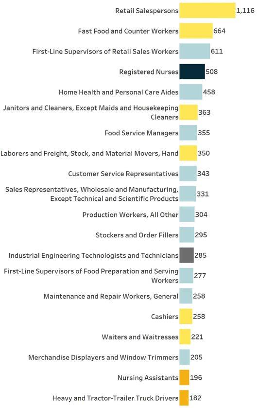 Retail Salespersons is the top posted occupation for 2023 with 1,116 unique online job postings, which requires no formal educational credential for entry, coupled with shortterm on the job training. Fast Food and Counter Workers (664 postings) and First-Line Supervisors of Retail Sales Workers (611 postings) round out the top three demanded occupations, requiring a High School diploma or equivalent and no formal educational credential, respectively, coupled with short term on the job training for entry. Most of the other in-demand jobs require no formal education or a High School diploma or equivalent, coupled with short-term onthe-job training.
