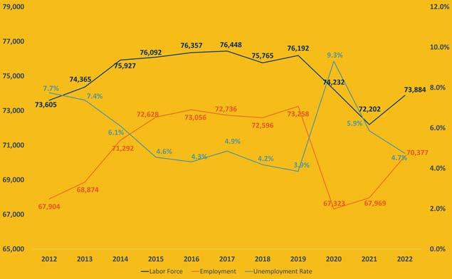 Following labor force fluctuations throughout 2022, labor force participation totaled 73,884 individuals, an increase of 1,682 individuals since 2021. Employment is up to 70,377 workers in 2022, an increase of 2,409 workers. Both unemployment and the unemployment rate decreased, corresponding with the economic recovery. Unemployment decreased to 3,506 workers, down by 727 workers since the high of 6,908 workers recorded in 2020. Similarly, the unemployment rate declined by 1.2 percentage for a 2022 unemployment rate of 4.7 percent.