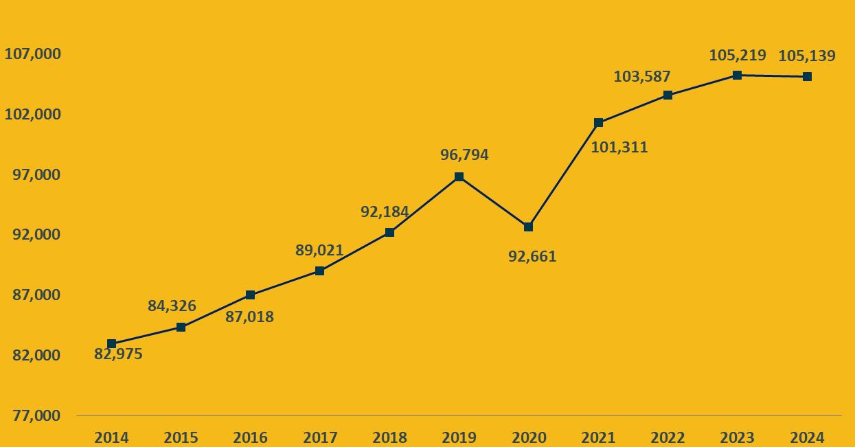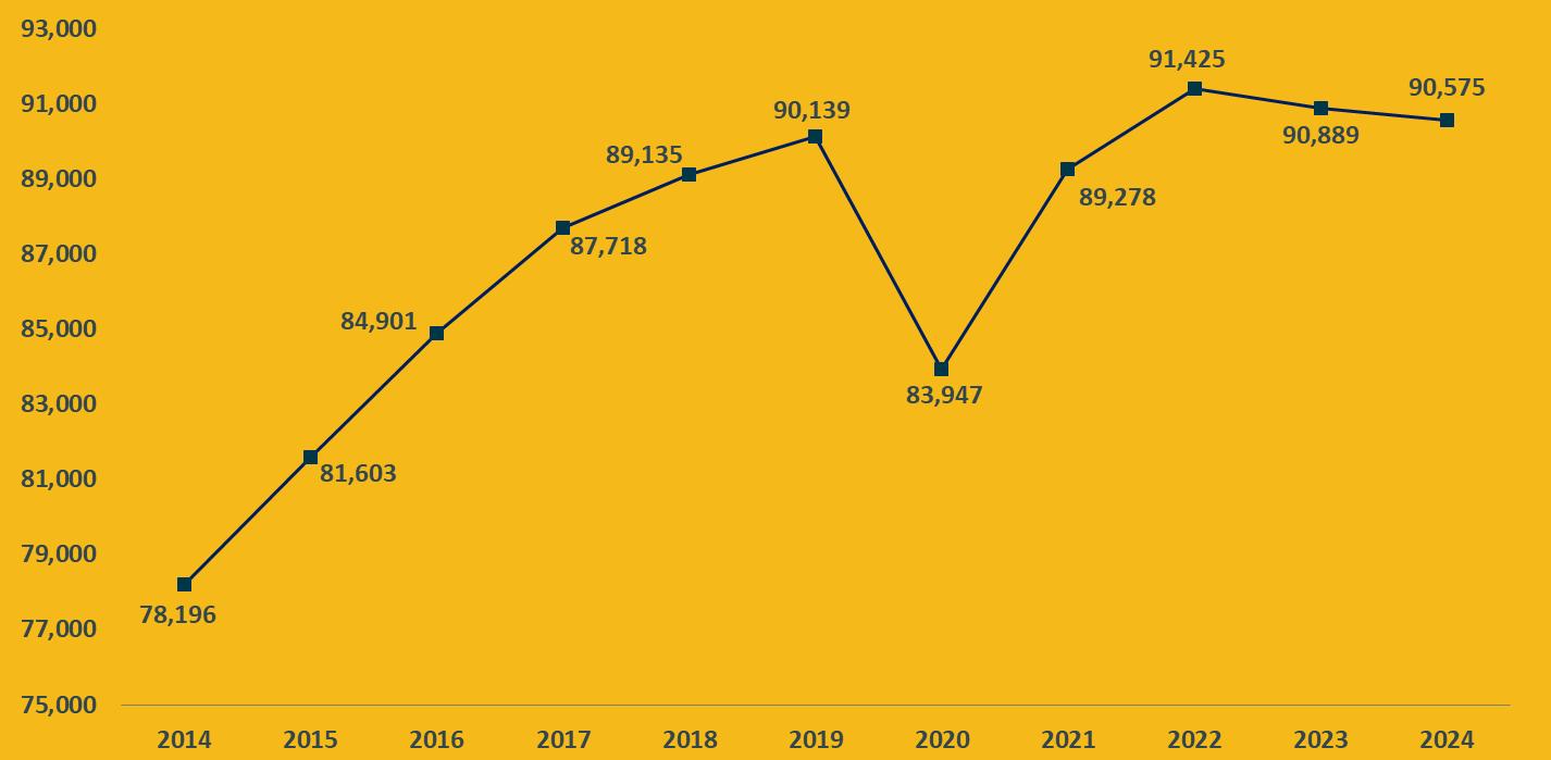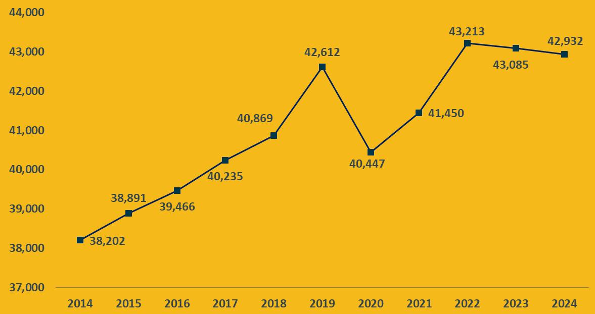 Most in-demand minimum education level during 2024 a decrease of 21,226 workers since Q4 2023 In 2024, employment totaled
