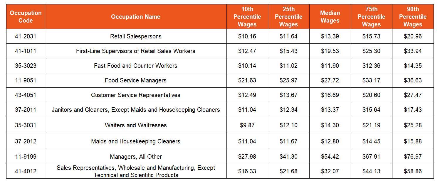 Despite being in high demand, most Customer Service-related occupations offer relatively low wages. The Customer Service occupation group offers a relatively broad array of entry requirements, and many jobs are open to candidates with a High School diploma or equivalent. At least half of the top jobs pay over $14.30 per hour. Retail Salespersons, the top posted Customer Service job, offers a median hourly wage of $13.39 per hour or an annual salary of about $27,851.
