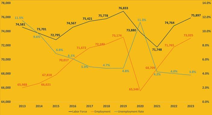 Following labor force fluctuations throughout 2023, labor force participation totaled 75,897 individuals, an increase of 1,133 individuals since 2022. Employment is up to 73,025 workers in 2023, an increase of 1,261 workers. Both unemployment and the unemployment rate decreased, corresponding with the economic recovery. Unemployment decreased to 2,871 workers, down by 5,463 workers since the high of 8,334 workers recorded in 2020. Similarly, the unemployment rate declined by 0.2 percentage points for a 2023 unemployment rate of 3.8 percent.
