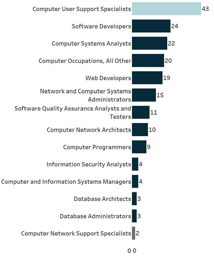In 2023, there were a total of 189 job postings for IT workers, with Computer User Support Specialists as the most sought-after occupation by IT industry employers with 43 postings. Software Developers was in the second position with 24 postings. Other top posted jobs include Computer Systems Analysts (22 postings), Computer Occupations, All Other (20 postings), and Web Developers (19 postings). Although the top IT jobs generally require a Bachelor’s degree, Computer User Support Specialists typically require only some college, no degree.
