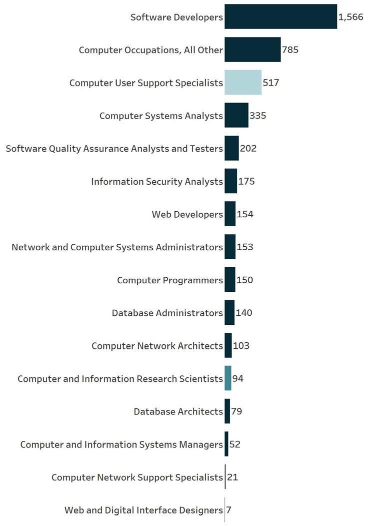 In 2023, there were a total of 4,533 job postings for Information Technology workers, with Software Developers as the most sought-after occupation by Information Technology industry employers with 1,566 postings. Computer Occupations, All Other was in the second position with 785 postings. Other top posted jobs include Computer User Support Specialists (517 postings), Computer Systems Analysts (335 postings), and Software Quality Assurance Analysts and Testers (202 postings). Although the top IT jobs generally require a bachelor’s degree, Computer User Support Specialists, typically require some college, no degree.
