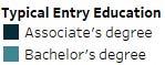 There were 109,163 online job ads open to individuals with zero to two years of previous work experience. Entry-level jobs such as Registered Nurses (9,522 postings) and FirstLine Supervisors of Retail Sales Workers (3,275 postings) represent the top posted occupations for this experience level, and many reflect the overall top jobs. Over half of the top 20 occupations require candidates to have no formal education or a high school diploma, coupled with short to moderate-term on-the-job training. Many applicants for these entry level occupations, regardless of the education requirement, could benefit from taking some coursework to develop the skills requested in job postings.