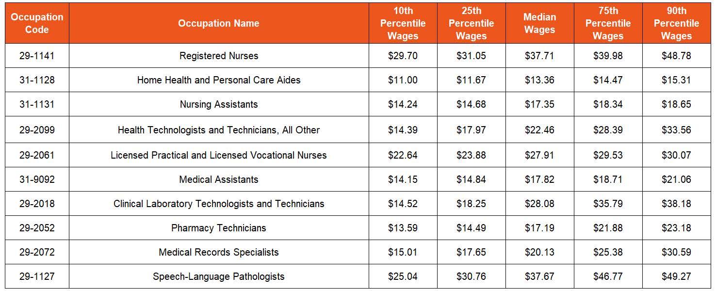 in the high-demand healthcare field tend to scale with both education and experience. The healthcare occupation group offers a relatively broad array of entry-level requirements and include a high volume of jobs open to candidates with less than a bachelor’s degree. However, most of the top-posted jobs that require less than a bachelor’s degree pay under than the state’s median wage of $21.73 per hour. Licensed Practical and Licensed Vocational Nurses, which require a Postsecondary nondegree award for entry, earn a median hourly wage of $27.91 per hour or annual salary of about $58,053. Wage Overview for Top Posted Healthcare Jobs in Q3 2022