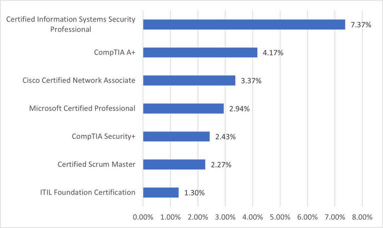 Specific IT-related credentials were an important highlight of the research, with strong agreement between labor market data and the industry survey Both data sets suggest a strong employer preference for credentials such as Microsoft Certified Professional, Amazon Web Services (AWS) Certified Solutions Architect, and Cisco Certified Network Associate