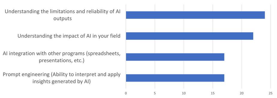 According to the survey results, the most crucial generative AI skills identified are diverse. Participants emphasized the importance of first understanding the limitations and reliability of AI outputs. Second, respondents underscored the significance of comprehending the impact of AI within their respective fields, emphasizing the need for strategic insight into how AI technologies reshape industries. Additionally, integrating AI with other programs emerged as a critical skill, emphasizing the importance of interoperability and synergy across technological platforms. Finally, prompt engineering was highlighted as a key skill, reflecting the demand for agile and efficient development practices in the context of AI applications.