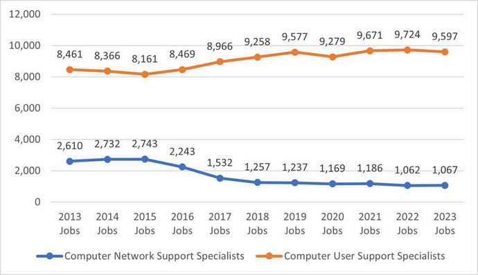 Lightcast utilizes a linear growth model for projecting job gains in the next 10 years. According to the data, employment for Computer User Support Specialists are expected to decline by 3.7% (351 jobs) by 2033 while Computer Network Support Specialists are expected to grow by 3.9% (42 jobs) in the same time period.