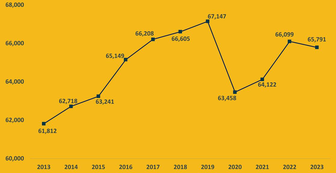 In2023,thetotalnumberofInformationTechnologyjobsintheU.S.is5,533,323,comparedto65,791inthe 6-countyregion NationalemploymentintheITsectorhascontinuedtogrowsince2013,althoughthe paceslowedsomewhatduringtheCOVID-19pandemic.Incontrast,employmentinthe3-countyregion experiencedasignificantdeclineduringthepandemicandhasnotyetfullyrecoveredtopre-pandemic levels